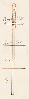 But he who does not pay attention to it, he will never learn to fence. Divisions of the sword to the Weak and Strong The Sword is firstly divided in two parts, namely from the grip to the middle of the Blade which is known as the Strong, from the middle to the most forward, is the Weak Item, the sword is further divided in four parts how the figure shows. With the inward part, that is the haft, and (with it) the work with the pommel and cross and haft will be understood, in the next part, thereafter will the work with cutting and pushing and what belongs to the Strong be understood, to the third part of the sword should be noted the alterable work of the Weak and Strong after opportunity and liking. Which alone is extremely weak for you to work properly to the Openings. Hard and Soft Thus you shall mark in the binding of the swords, as you shall feel if he has become hard or soft in the bind, with the cut. Item; If he is yet again, strong or weak, and is usually more watchful of the weak binding before the strong, how hereafter in the fencing it can be seen. Note: Above appears in Lund 7.1v-8.r |