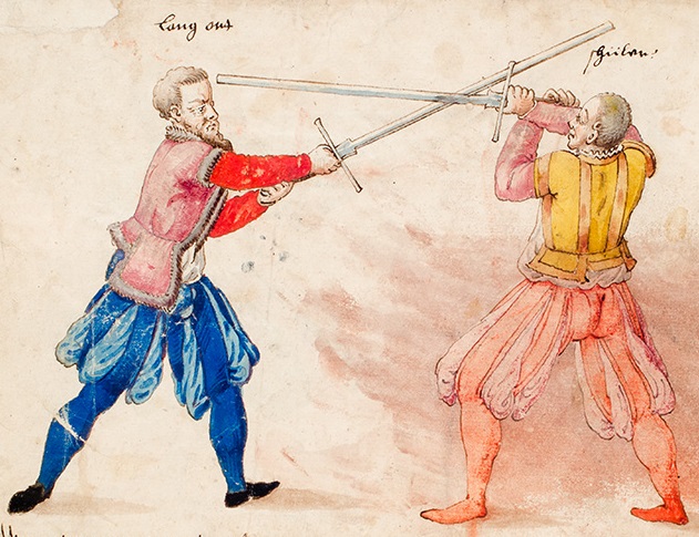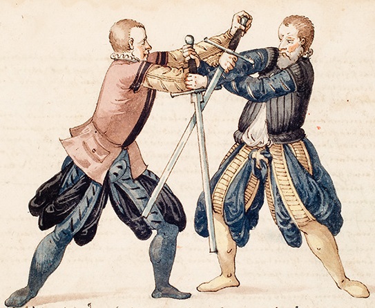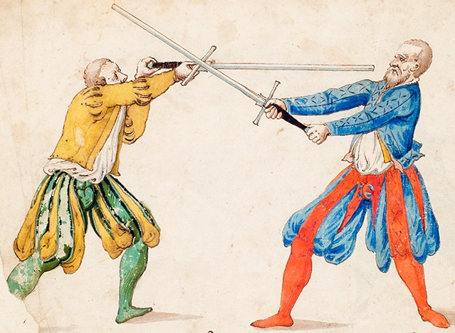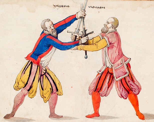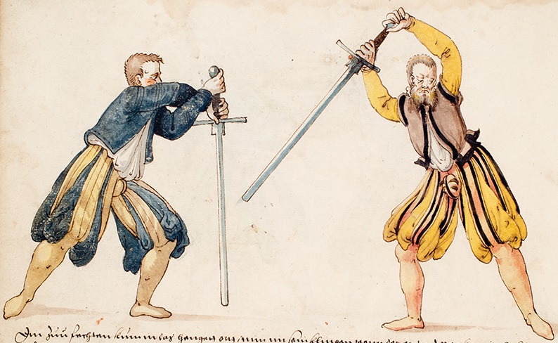 Guard yourself against parrying, if need befalls you it will hurt you. Therefore every fighter should be accustomed to be the first to attack and finish, then if every fighter is accustomed to watch and wait for another, this same rarely comes away without harm, or at the least does not achieve very much. A proper fighter however does not parry much unless he has a great advantage, And when the opponent strikes so he strikes too, if the opponent thrusts then he thrusts too, if the opponent steps, he steps also. For when two like strokes come together, they bring their parrying with them, and when someone cuts from above and you cut against it with a Thwart, then you parry and hit at the same time. Likewise you shall pay attention to simultaneous cutting and take good heed of your advantage in it. Therefore, every fencer should know that he should quickly consider, as mentioned above, when two good fencers come together, which I consider is the same as shown before.* Thus I have briefly summarized and presented sword fencing and all needful techniques, and also explained the somewhat obscure words in part, and thereafter integrated them into an attack combination, dividing it into three parts, namely (as I said initially) the beginning or attack, the followup or middle-work, the last withdrawal or end. So that you may understand it better I will repeat briefly, as follows: for the attack I have presented the guards, in which you should not tarry and wait, but through which you should attack to the uttermost with one or two of the described cuts according to opportunity. Now when you have attacked and the Before has run off from you, then in the second part you shall follow up with all kinds of proper handworks, so you keep the Before, these handworks are also presented above. Thirdly you should crowd and confine him with handworks so that you can come to the withdrawal without harm Note: here I have included this line for clarity from Dr. Forgeng’s 1568 Lund translation: “Therefore every fighter shall know as has been said above, for when two good fighters come together, whoever thinks quicker triumphs quicker.* |